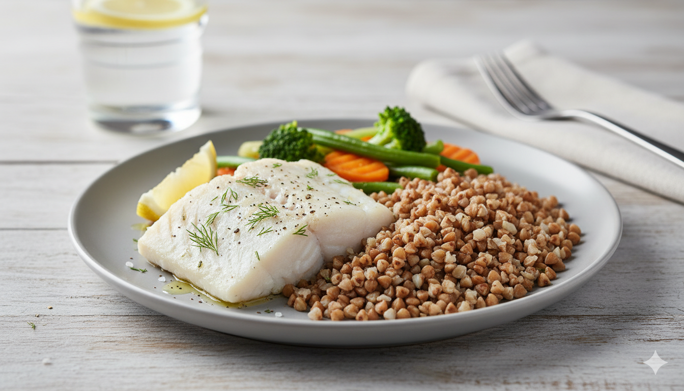 Posiłki dietetyczne Zdrowie cukrzyca, dieta niskokaloryczna, kasza gryczana, mintaj, zdrowe odżywianie Niskokaloryczny mintaj z kaszą gryczaną – idealny posiłek dla diabetyków
