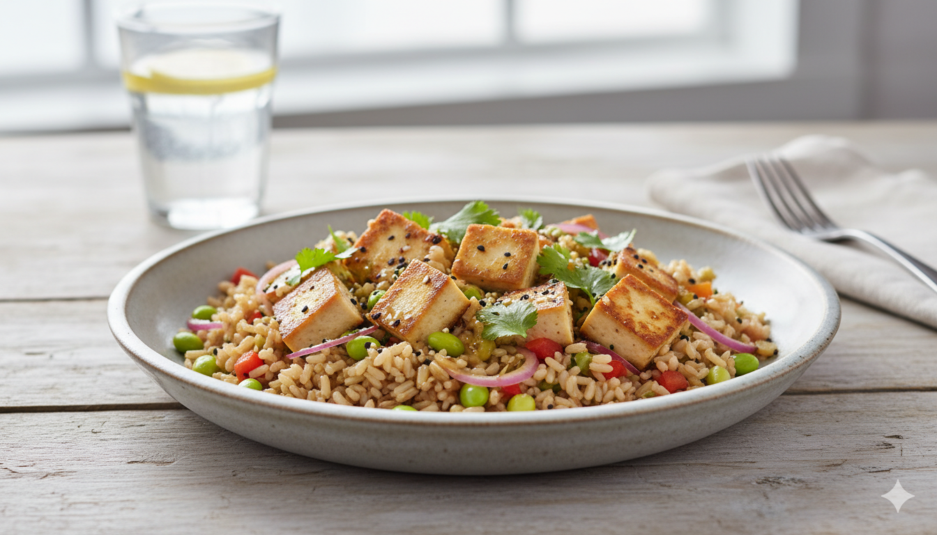 Posiłki dietetyczne Zdrowie cukrzyca, dieta wegetariańska, odchudzanie, przepisy niskokaloryczne, zdrowe odżywianie Prosta sałatka z tofu i brązowym ryżem – lekki posiłek dla wegetarian