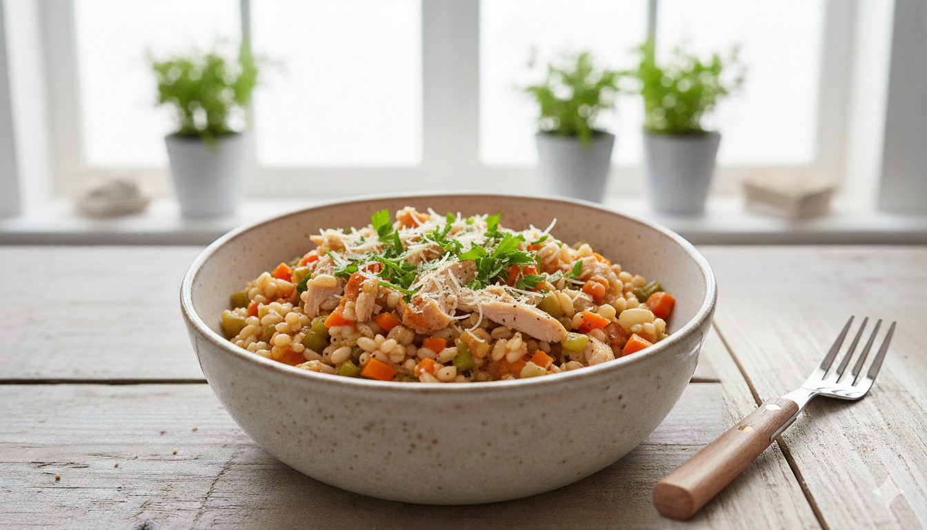 Dieta Odżywianie Posiłki dietetyczne błonnik pokarmowy, kasza jęczmienna, trawienie, zaparcia, zdrowe przepisy Kaszotto jęczmienne z indykiem – smaczny sposób na problemy z zaparciami